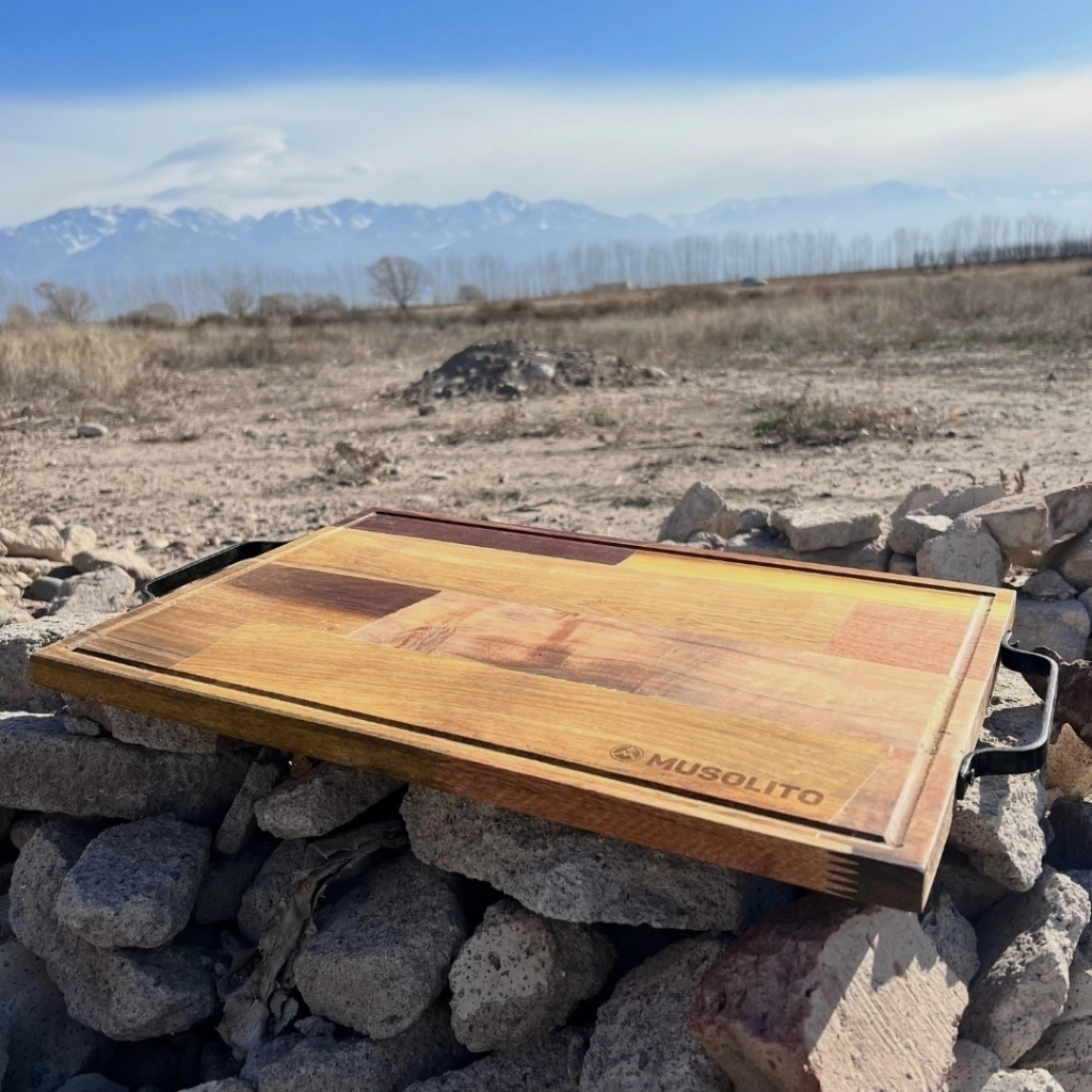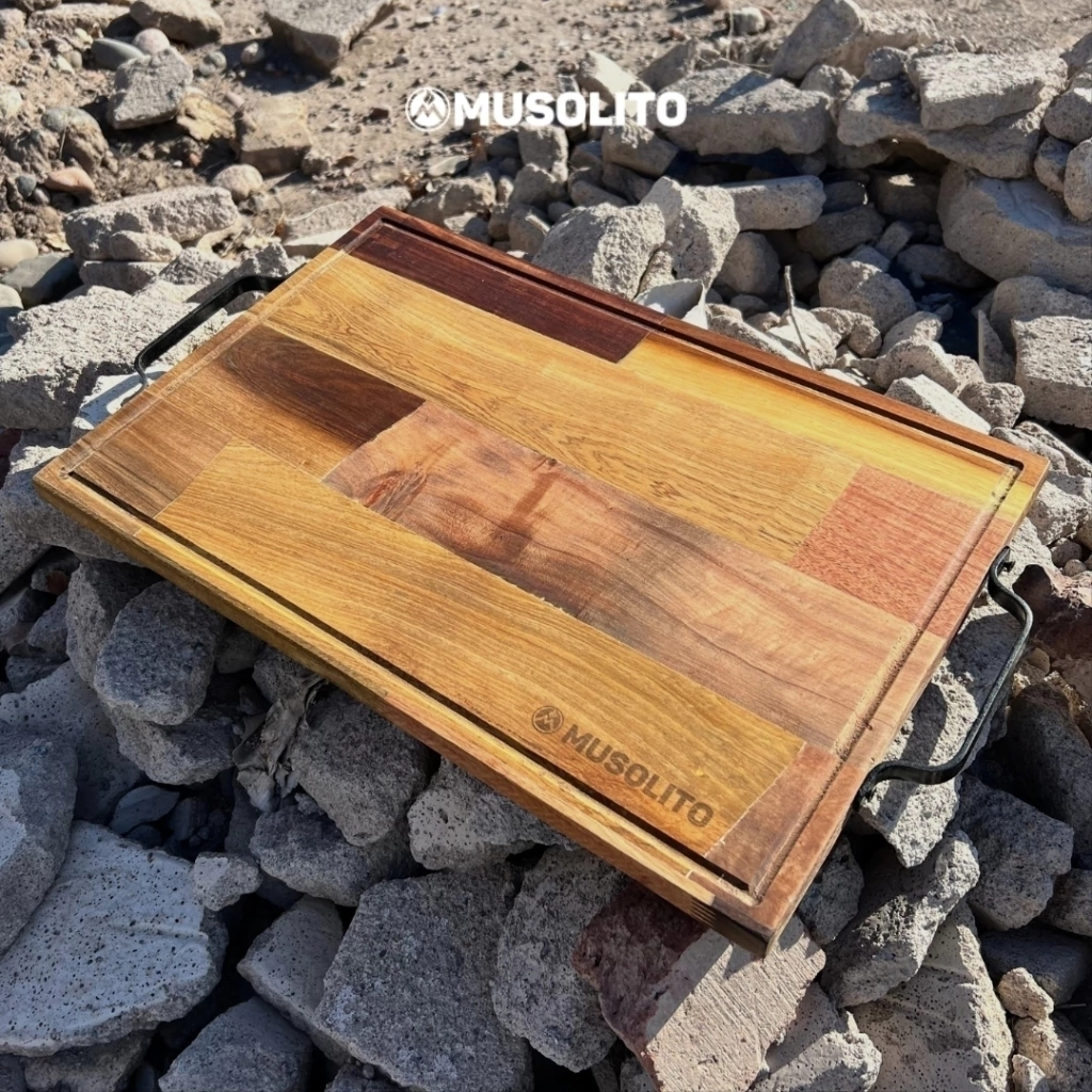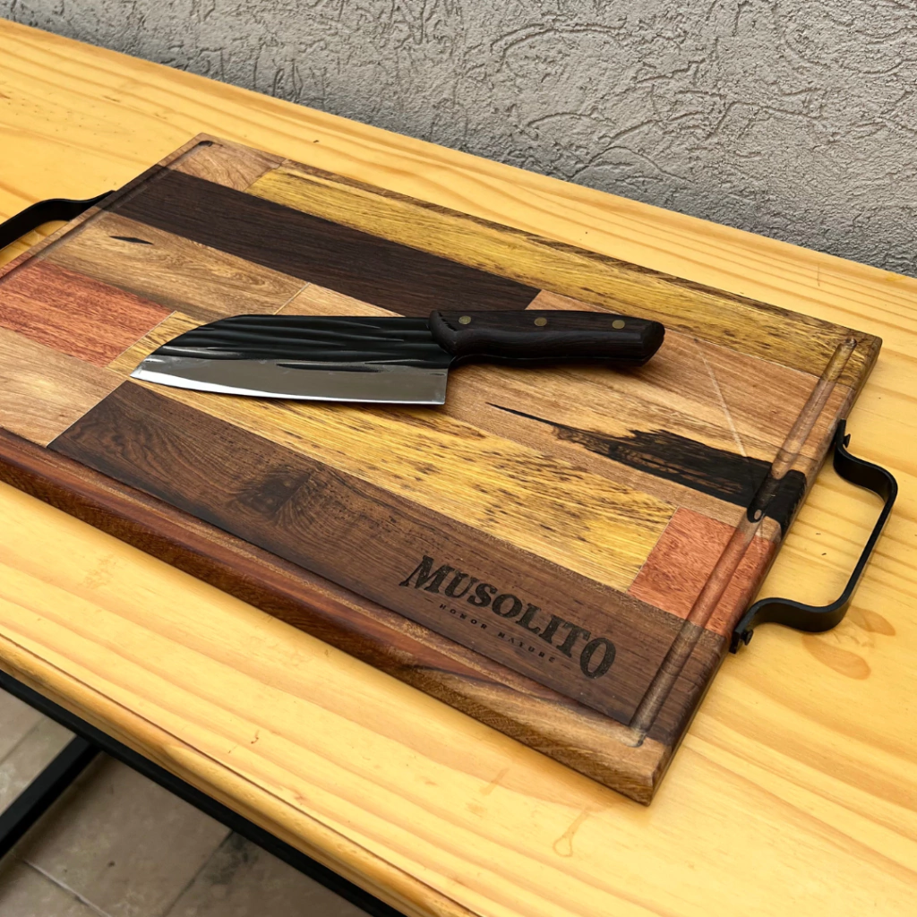 La Centella es una tabla grande con alma de tormenta. Fabricada en maderas multicolor del monte misionero, combina naturaleza salvaje y arte criollo. Las manijas de hierro le aportan solidez y presencia, ideal para quienes no solo cocinan, sino que comandan el ritual del fuego.